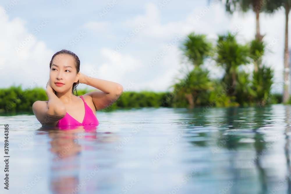 Portrait beautiful young asian woman relax enjoy around outdoor swimming pool
