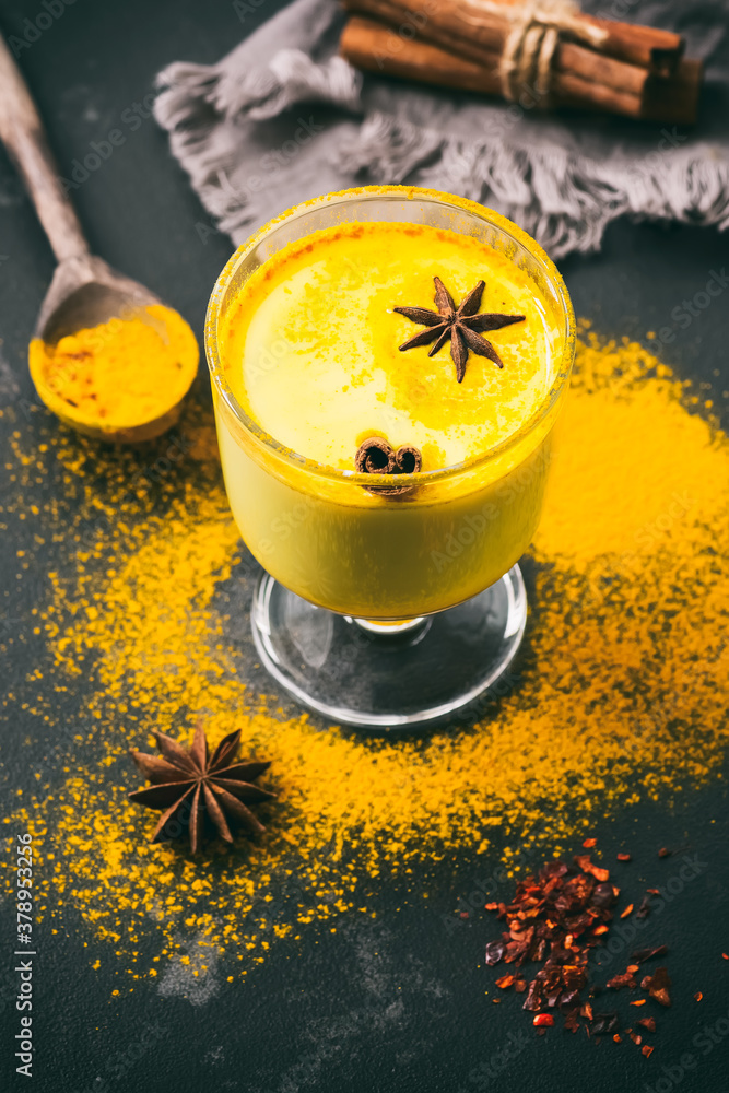 Golden milk. Traditional Indian drink with turmeric, cinnamon, star anise. Selective focus.