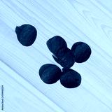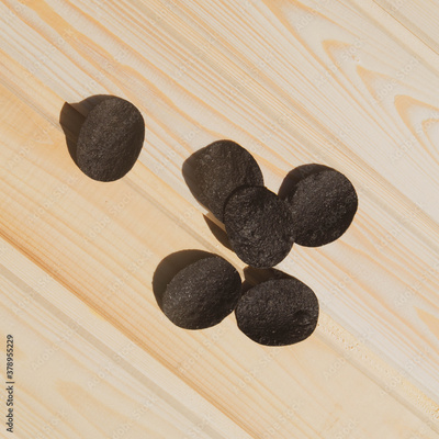 Black potato chips on the wooden surface of the table. Background.