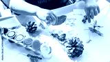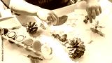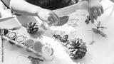 Toddler boy is home schooled paiting yellow leaves and pine cones in fall with eco friendly paint. Sensorial activity at home.
