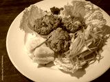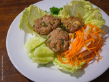 Homemade rustic pork meatball with vegetables served in a white plate on a teak wood table. Diagonal view from the top.