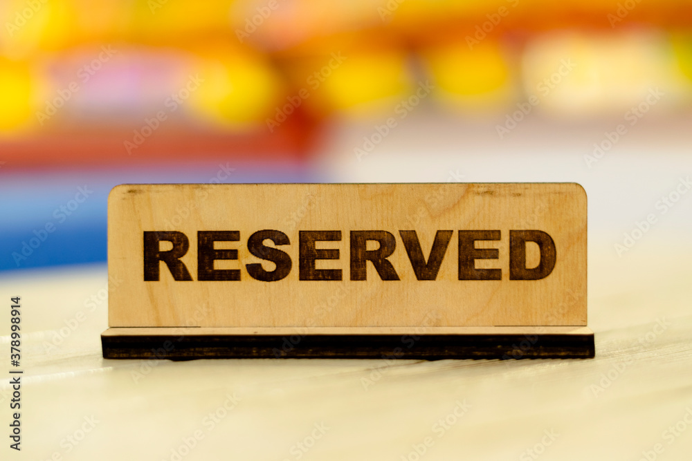 Placard with the words "Reserved". A table in a cafe.
