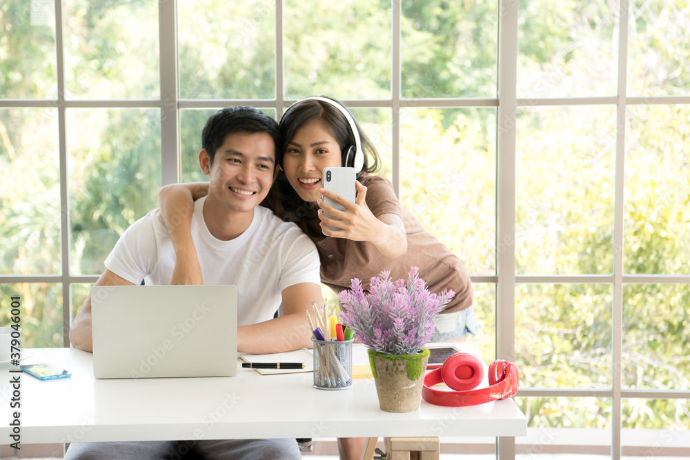 Cheerful Asian couple taking a selfie with a smartphone at home with selective focus on phone