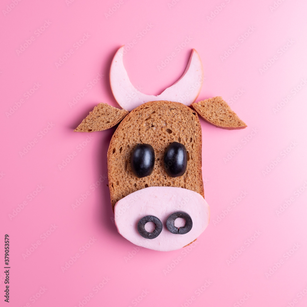 Breakfast for a child, toast with a funny head of a cow. New Year's festive snack, symbol of the year, decoration of the festive table.