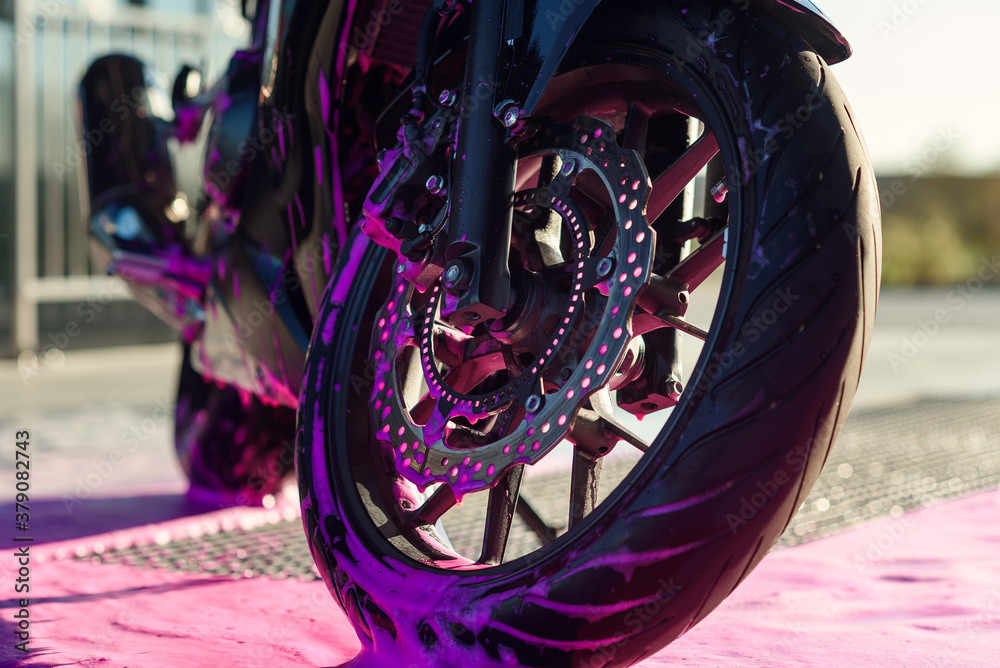 Close up wheel of stylish sports motorcycle with foam on the self-service car wash at sunrise.