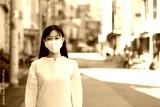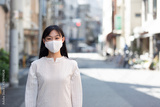 マスク姿の若い女性。 COVID-19 パンデミックコロナウイルス。病気の拡大を防ぐマスクを着けている若い女性のポートレイト。