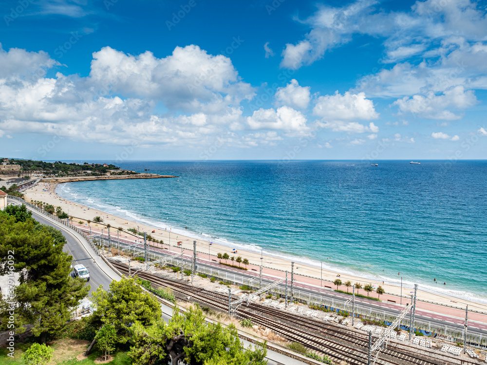 Vías del tren al lado de la playa y cielo con nubes blancas