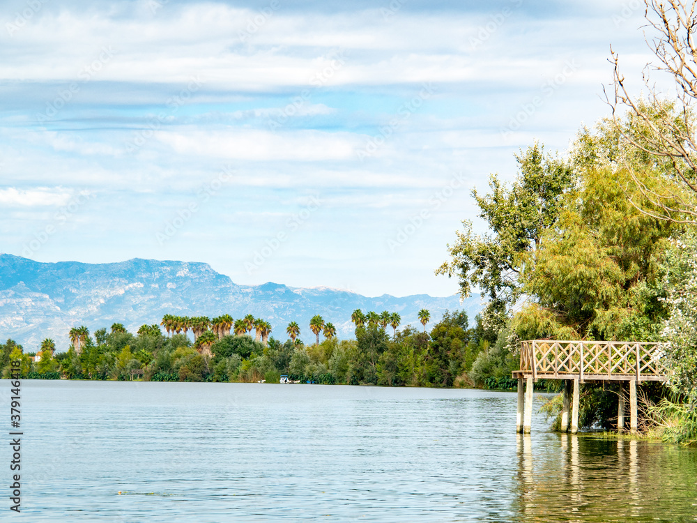 mirador en el río con montañas de fondo