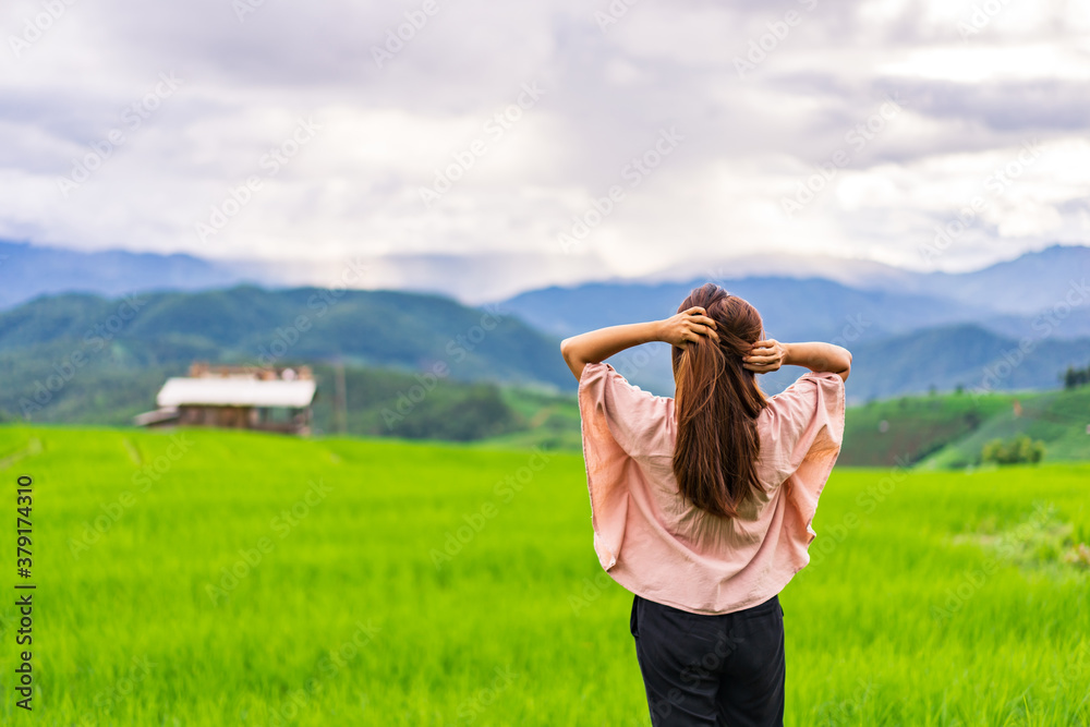 Young woman traveler on vacation enjoying and looking at beautiful green rice terraces field in Pa Pong Pieng, Chiangmai Thailand