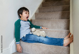 Portrait tired kid yawning sitting on staircase, sleepy boy yawning while playing with teddy bear, Child having allergy during weather change, Childhood has reflection or hay fever from dust mite