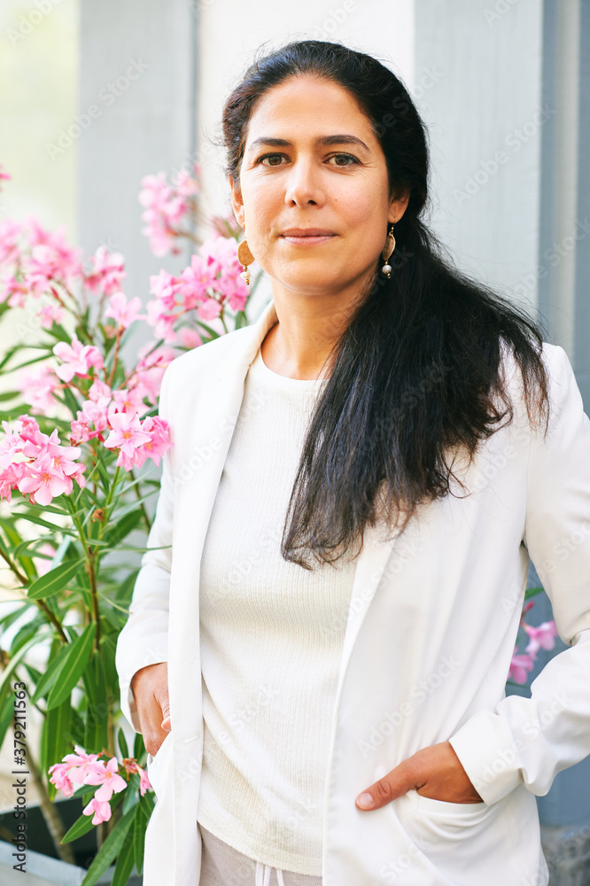 Beautiful middle age woman posing outside, wearing white jacket, standing next too pink flowers