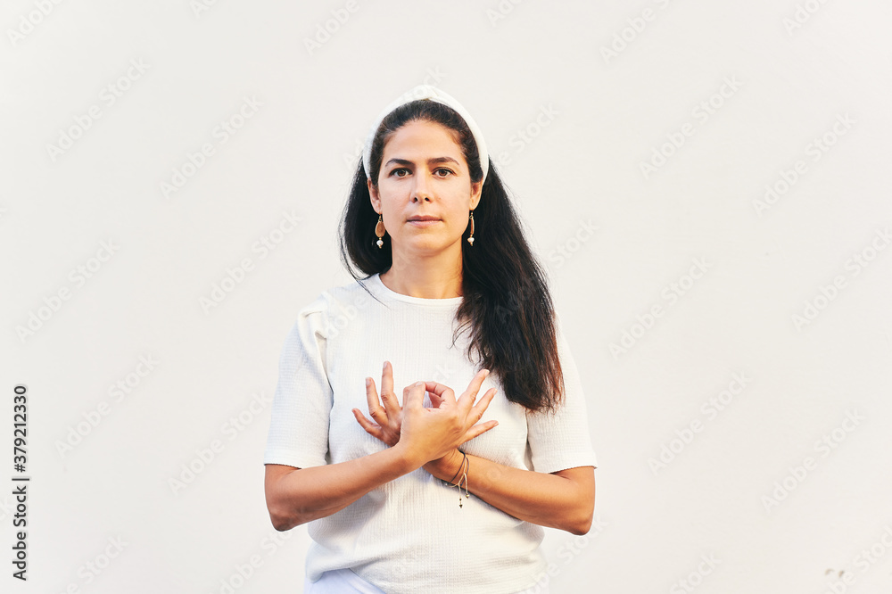 Portrait of woman holding gyan mudra next to heart, hand position from Kundalini yoga meditation Love is Love. This meditation removes any duality between love in your life and love in your soul