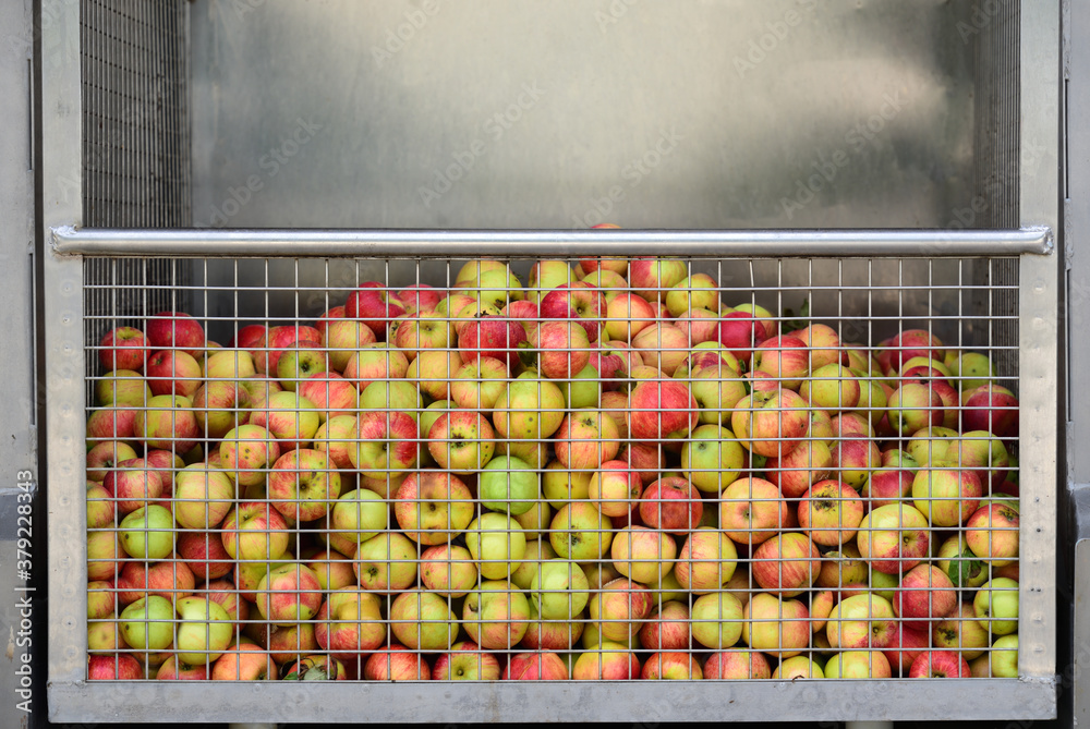 Freshly picked apples from the home garden are placed in a juicer behind a metal grille to be pressed