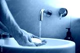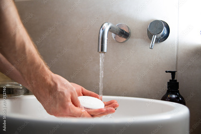 Washing hands with a soap in an elegant bathroom sink, side view.