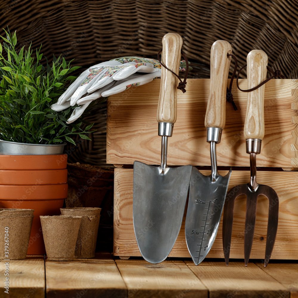 Gardening tools on a wooden table before fall cleanup