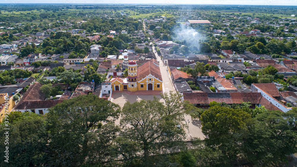 Close up aerial view of the historic town Santa Cruz de Mompox in sunlight and Iglesia De Santa Bárbara (church of Saint Barbara) Colombia, World Heritage