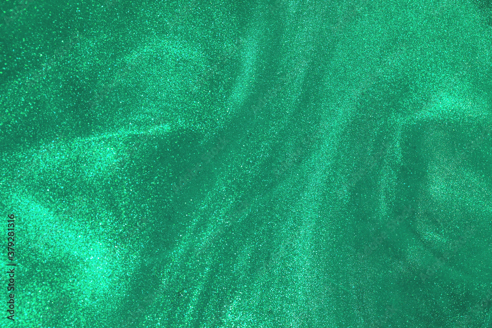 de-focused. Abstract elegant, detailed mint glitter particles flow with shallow depth of field underwater. Holiday magic shimmering luxury background. Festive sparkles and lights.