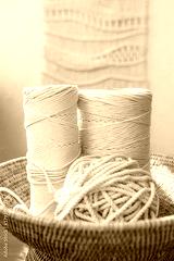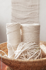 Handmade macrame braiding and cotton threads on rustic wooden table. Hobby knitting cotton thread in woven basket on a wooden board. Female hobby