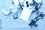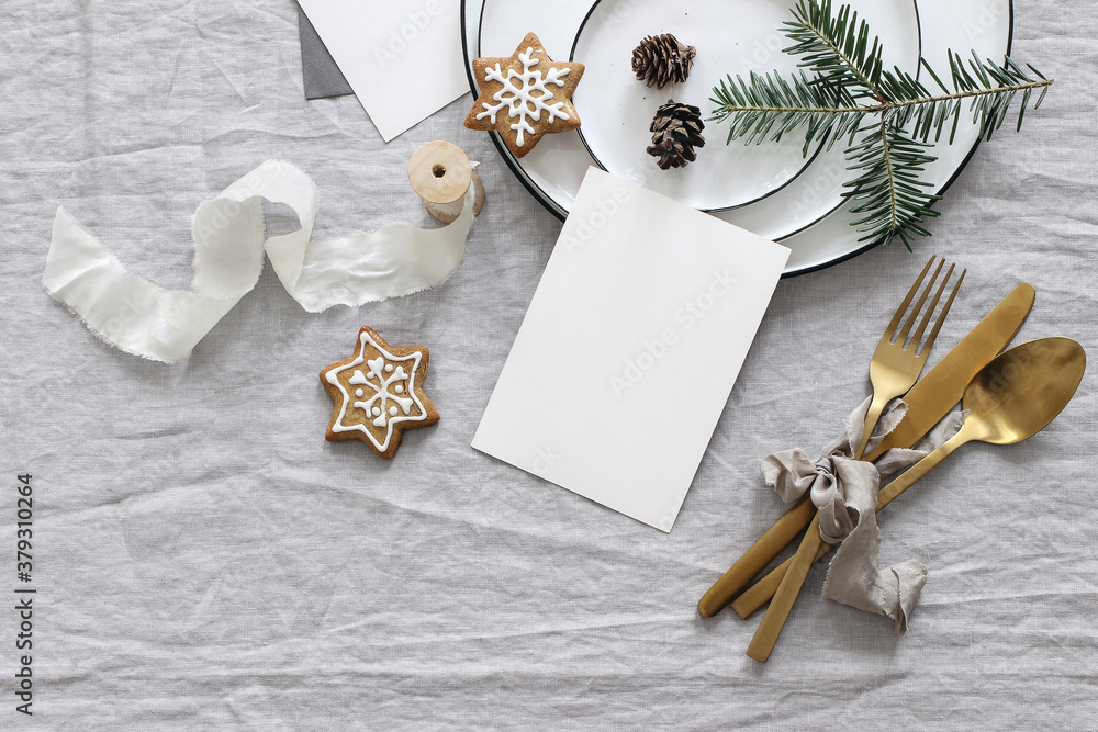 Plates, pine cones on table cloth. Winter festive greeting cards mockup scene. Golden cutlery,gingerbread cookies and fir tree branches. Christmas table setting. Holiday background. Flat lay, top view