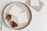 Autumn composition. Blank memo cards mockups, craft envelope and dry beech leaves on white linen table cloth background. Fall and Thanksgiving concept. Styled flat lay photography. Top view.