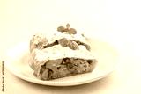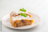 Apple strudel with raisins, peanuts and cinnamon. South Tyrol recipe. Light background. Copy space. Minimalistic.