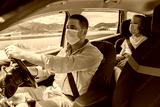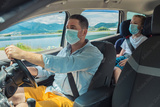 Father and son in protective masks driving car, Happy traveler family. Bonding Travel, Summer, Holidays, Journey, Trip concept.