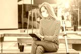 Female wearing masks working over tablet, while sitting on seat in town. Woman face wearing masks. Long distance communication. Staying connected.