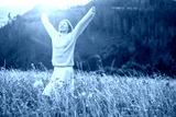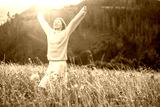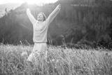 Happy woman enjoying sunset stay on the green grass on the forest peak of mountain. Fresh air, Travel, Summer, Fall, Holidays, Journey, Trip, Lifestyle.