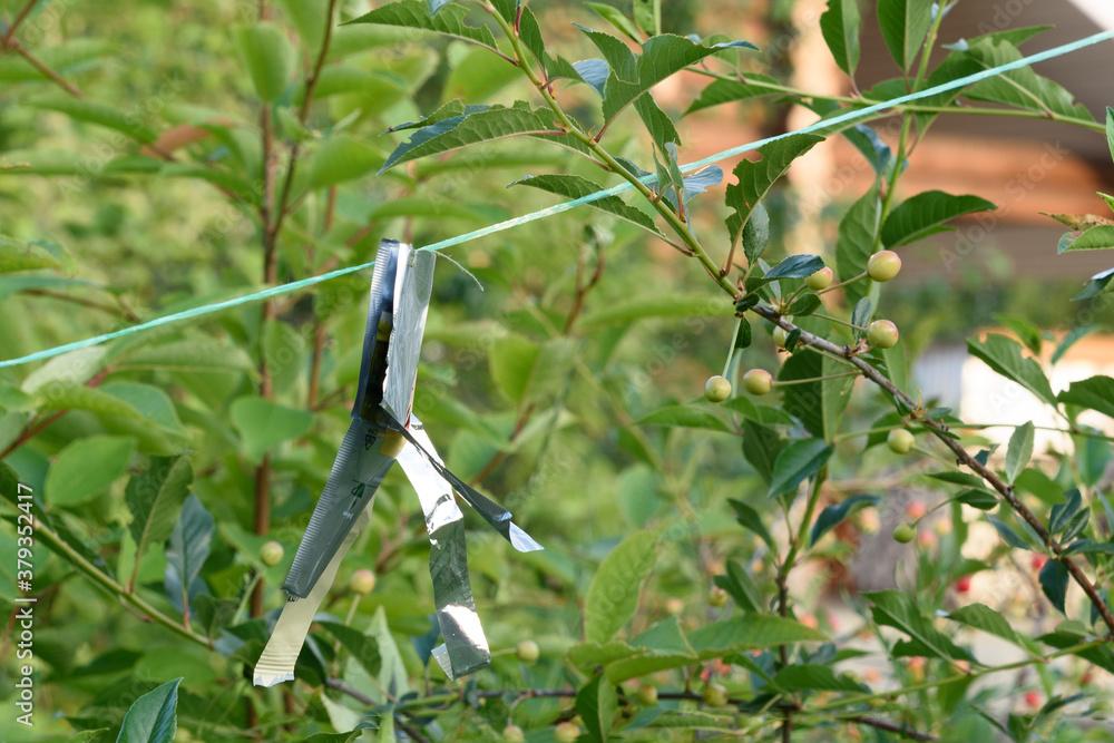 A shiny paper is tied to a plastic thread to scare birds away from spiced cherries