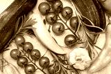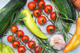 Set of different seasonal vegetables on a gray concrete background. Tomato zucchini onion garlic rosemary pepper spices.