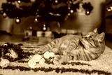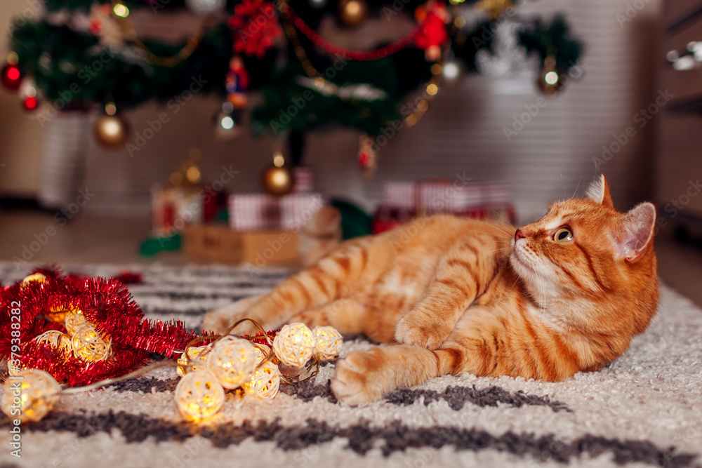 Ginger cat playing with garland under Christmas tree lying on floor. Christmas and New year concept