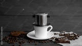White cup of coffee with a metal filter on a top and scattered beans on a wooden table. Traditional vietnamese coffee.