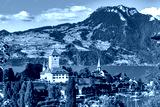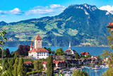 Spiez Church and Castle on the shore of Lake Thun with yachts in the Swiss canton of Bern, Spiez, Switzerland.