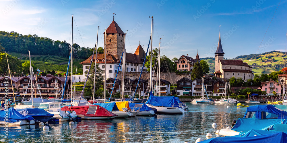 Spiez Church and Castle on the shore of Lake Thun with yachts in the Swiss canton of Bern, Spiez, Switzerland.