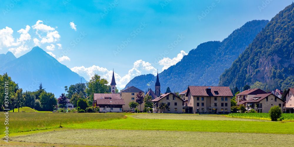 Panorama of Old City of Interlaken, important tourist center in the Bernese Highlands, Switzerland