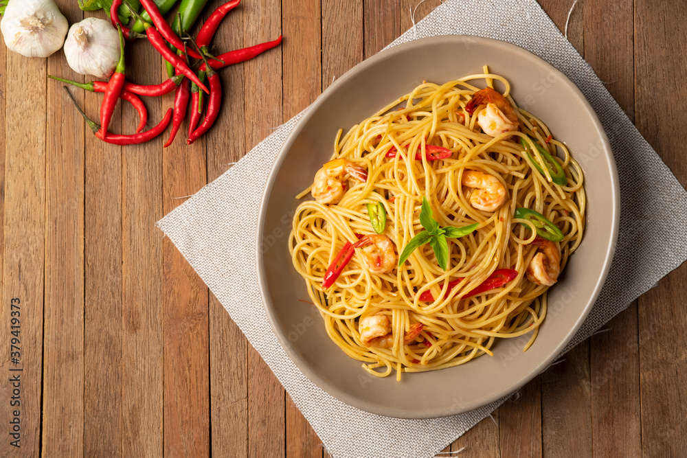 stir fried spicy spaghetti with shrimp and basil,Pad Kra Pao kung.Top view