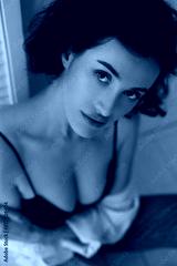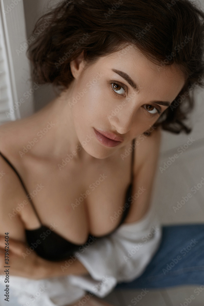A fashionable young woman with nude trendy makeup and big breast in a seductive black bra posing in studio. Beautiful model girl with deep seductive eyes.