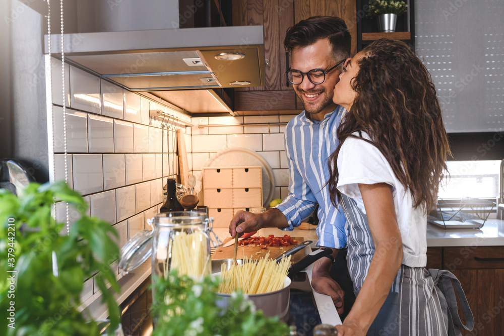 Young cheerful multi ethnic couple preparing pasta together at their modern kitchen