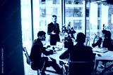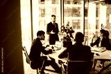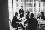 Group of colleagues discussing business ideas at conference in modern workspace