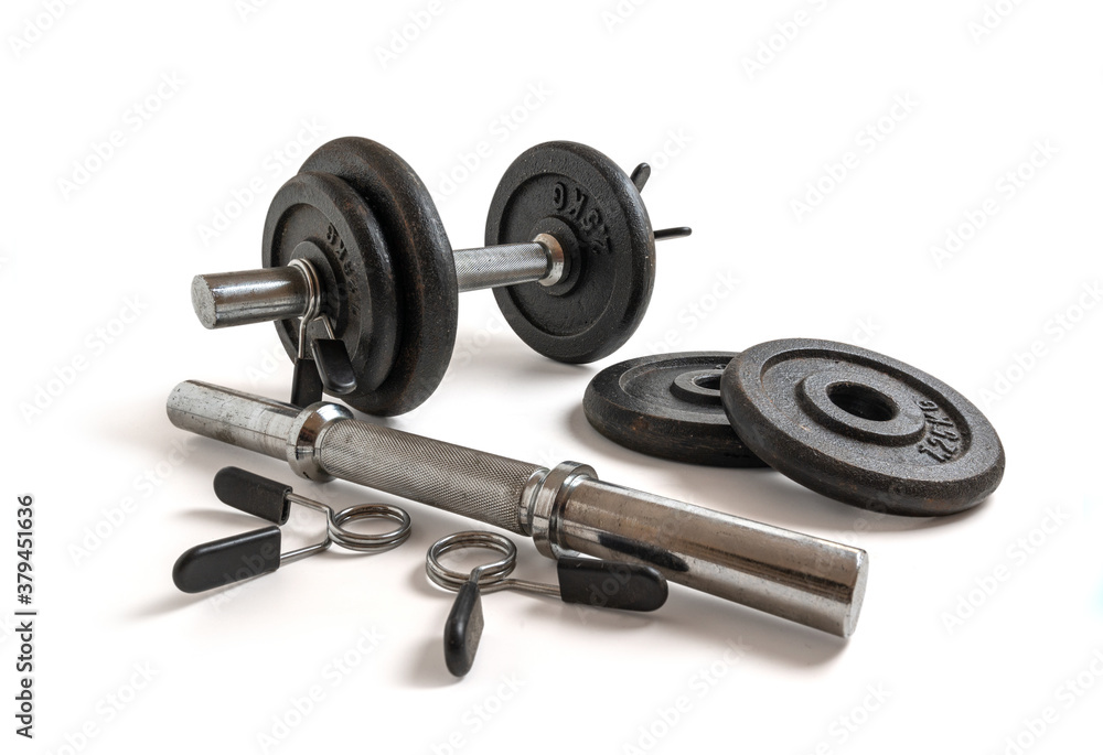 Metal dumbbell set. Isolated on white background. Gym, fitness and sports equipment symbol