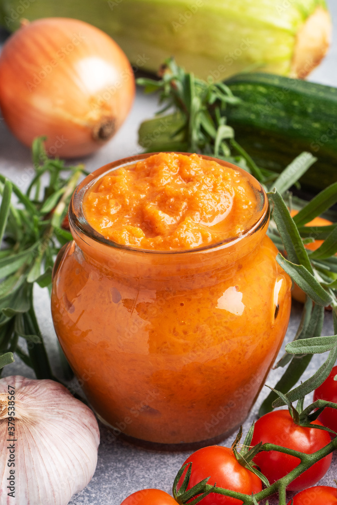 Homemade caviar from zucchini tomatoes and onions in a glass jar on a gray background. Homemade production canning, canned stewed vegetable.