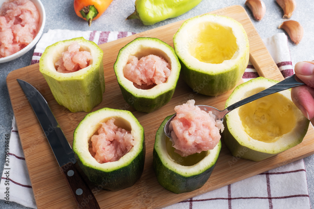 Raw zucchini is prepared for stuffing with minced chicken and vegetables.