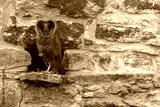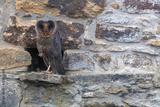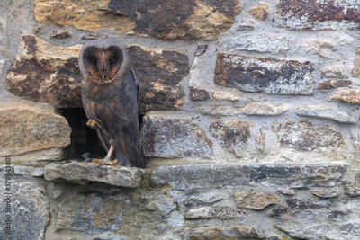 Cool barn owl in dark form is standing on one leg posing at stone wall closeup.