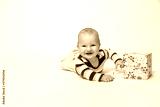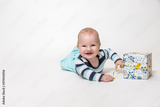 Smiling toddler boy is holding Christmas package lying on the floor