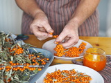 Picking sea buckthorn berries from branches. Hobby of an elderly woman, hands hold sea buckthorn berries.Protect ourselves from influenza.