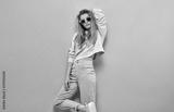 Fashionable hipster woman in Trendy outfit, stylish hair, makeup on pink purple neon light. Redhead model in hoodie, fashion jeans, sunglasses. Beautiful bad sexy girl in neon style