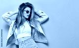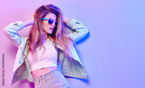 Fashionable hipster woman in Trendy outfit, stylish hair, makeup on pink purple neon light. Blonde model in hoodie, fashion jeans, sunglasses. Beautiful bad sexy girl in neon style