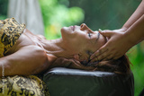 Masseur doing relaxing anti-aging face massage on mature woman body in luxury outdoor spa salon in nature. Beauty, wellness and health care
