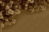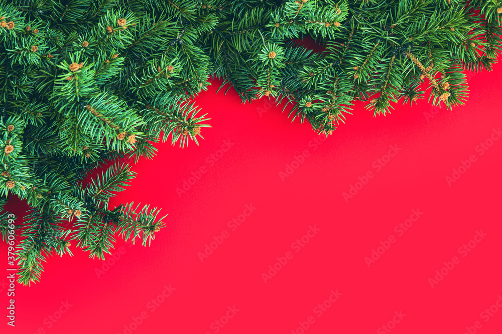Festive composition with border of fluffy dark green fir branches on red background. Top view, flat lay style, copy space for text.