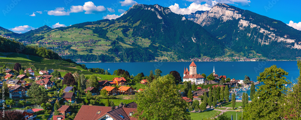 Spiez Church and Castle on the shore of Lake Thun with yachts in the Swiss canton of Bern, Spiez, Switzerland.